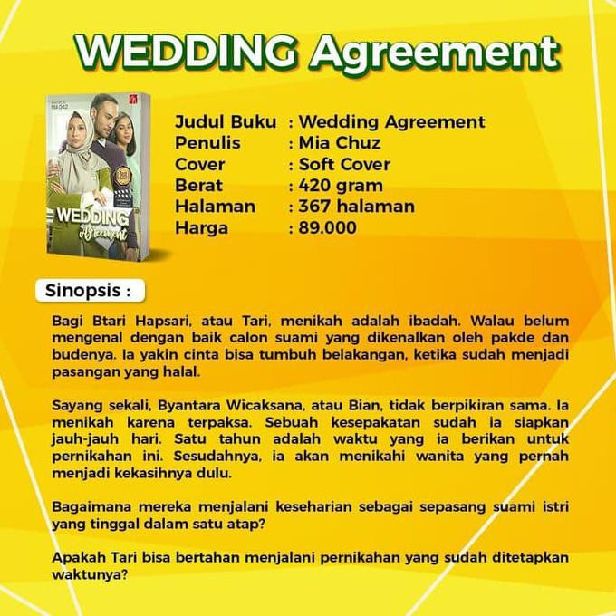 Btari hapsari indah permatasari tidak menyangka pernikahannya jadi mimpi buruk. Wedding agreement weddingagreement karya mia chuzaimiah setelah saya terserang virus elena oleh mbak ellya ningsih sekarang jatuh cinta sama cerita yang satu ini novel wedding agreement karya mbak mia chuzaimiah nama facebookdisini saya akan mengulas beberapa saja tidak akan banyak karena ingin membuat penasaran yang belum baca. Banyak sisi manusiawi yang ada di kehidupan nyata di sajikan dengan berbagai macam karakter tokoh sehingga terkesan cerita ini nyata.